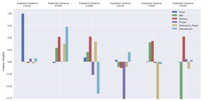 我们以第一个成分和第三个成分为例说明。第一个成分的方差解释是0.8722,也就是说该成分能够解释87.22%的数据,如何解释?通过权重组合各特征值。我们看到,fresh特征有非常大的正权重,其他特征值的权重较小,所以第一个成分通过组合较多的fresh特征和较少的其他特征就可以解释87.22%的数据。换句话说我们可以将原来的6维特征数据降为1维特征数据,依然能够对原数据的87.22%进行解释。