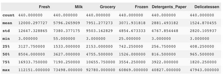 观察发现,一共有6个特征值,包括'Fresh', 'Milk', 'Grocery', 'Frozen', 'Detergents_Paper', 和 'Delicatessen'。分别代表'新鲜食物', '牛奶', '杂货', '冷冻食品', '洗涤剂和纸类产品', 和 '熟食'