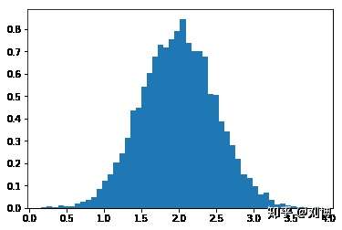 >>> plt.hist(v, bins=50, density=1); # matplotlib version (plot)