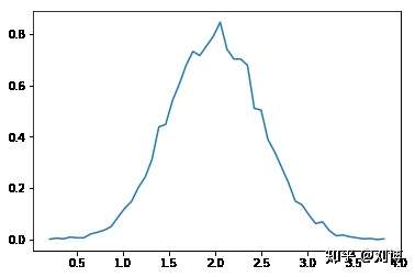 >>> plt.plot(.5*(bins[1:]+bins[:-1]), n)