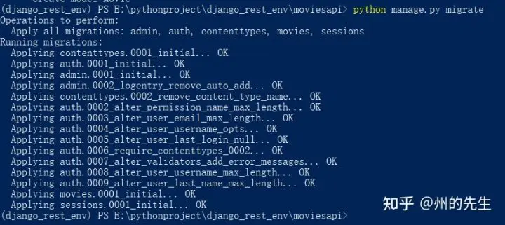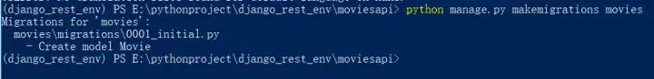 python manage.py makemigrations movies其会提示我们模型中将会创建一个Movie模型: