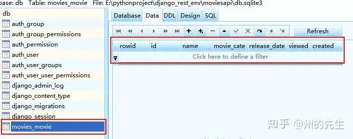 左侧的db下,显示的就是我们这个db.sqlite3数据库中所包含的数据库表,可以发现我们在movies应用下定义的movie模型也在其中。点击movies_movie表,右侧的内容栏会出现这个表的信息: