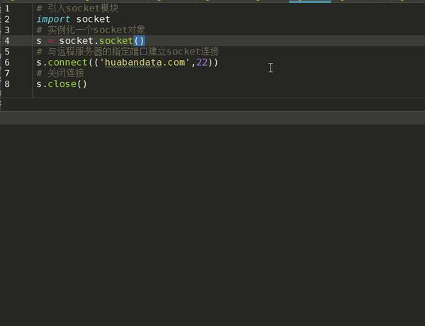 s.close()上述代码我们就通过socket模块的socket()函数建立了对http://huabandata.com这个域名的22端口的socket连接,然后进行了连接的关闭。