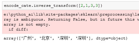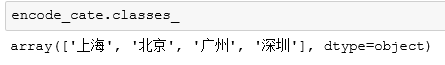 可以发现,我们的四个城市名称字符串被编码为了值为1、0、2、3的数组。那么如果取回之前的字符串数据呢,可以使用classes_属性进行取回: