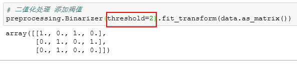 似乎其将小于0的数据都处理为了0,大于1的数据都处理为了1。我们可以对其指定threshold参数来设置二值化的阀值,下面请看: