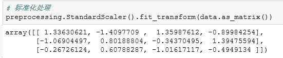 我们调用preprocessing模块的StandardScaler()方法,对data数组进行标准化缩放,结果返回了一个数值差异比原始数组小多了的数组。