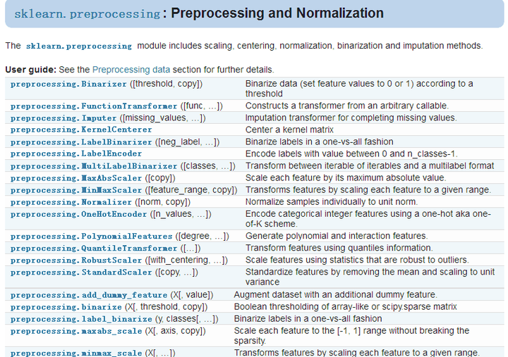 除了上述介绍的sklearn的数据预处理方法,还有很多没有提及到,在sklearn的官方文档中,大家可以详细去了解:
