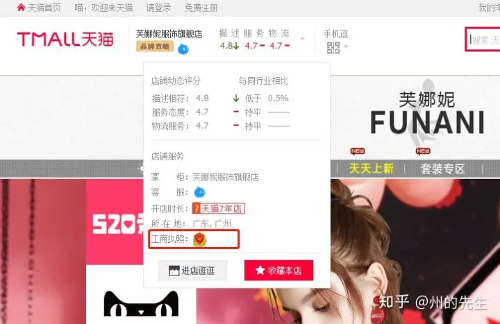 这个工商执照信息从哪里看到呢?就在天猫店铺的页面,店铺名称信息附近就可以查看得到,如下图所示: