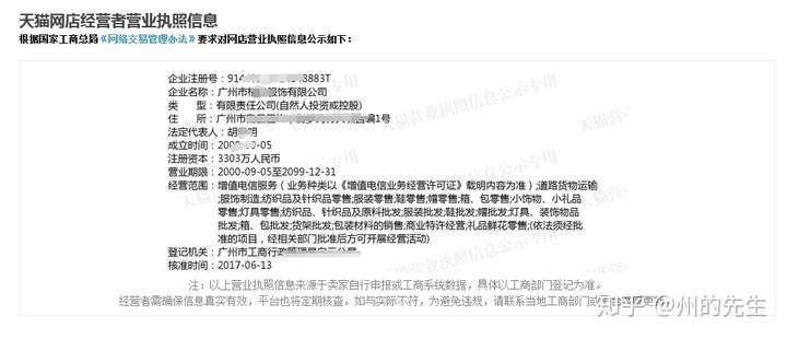 点击工商执照后面的国徽,我们就可以看到天猫店铺对应的在工商部门登记注册的企业信息: