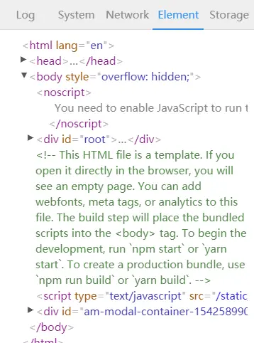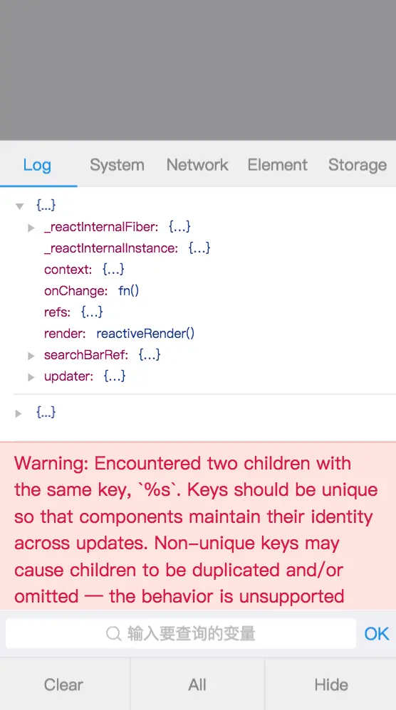 log 的实现不难,就在原有 winodw.console 方法的基础上,添加参数收集功能,并交由 mobx 管理。再将参数通过树形结构的方式展示给用户。但是,这种方式可能造成非常多不必要的渲染,每次调用 console 方法 ( 包括 error 和 warning),都会触发相应的 render ,如果在 log 组件的 render 方法里面调用 console 就会造成栈溢出 (相当于在 render 调用 setState),不过好在这只是用于开发中的调试阶段,另外,对于线上 bug 排查,我们可以用 charles 代理的方式注入代码而无需影响原有代码。即便如此,前端自己实现的浏览器控制台还是无法跟原生控制台媲美的 (最多用来看下有没有报错,又不想使用麻烦的 inspect 模式) ,比如追踪调用栈,以及 script error。所以,为什么要使用 Typescript,很重要的一点是尽可能地在开发阶段规避一些 bug。但面对海量级用户,手机千奇百怪,这时就只能通过前端异常监控,专业的有 fundebug 或者自己简单处理一下。扯远了,还是回到我们走马观花的下一部分 system 吧。