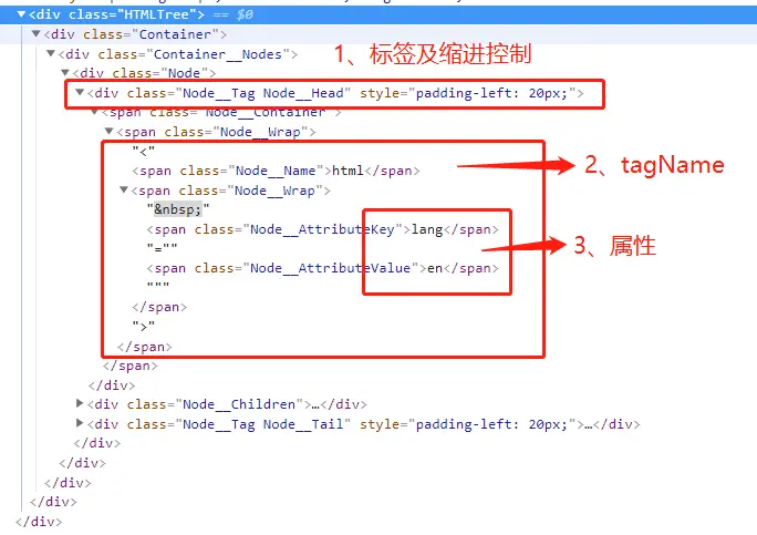 对于元素 (标签) 我们只需要知道两种不同的展示方式,自闭合标签以及非自闭合 (对于UI来说,仅仅是缩进的区别),以及它们都是由标签名和属性组成,如:<body style="background:#000"></body> 或 <img src="...">。下面看下要实现这样一个 elemnt 的 html 结构是怎么样的: