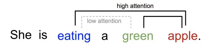 同样,在自然语言处理任务中(如上图),举个栗子,当我们看到 “吃” 这个词的时候,我们的注意力会马上集中在某种食物的名字上,而对其他形容词则相应的注意力会降低。