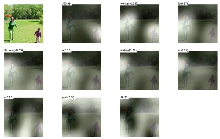 通过可视化处理的 attention 权重图可以很明显看出图片的不同区域相对于输出 descriptive words 的 match 程度,