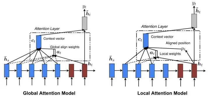 Luong, et al., 2015 提出了 global 和 local 两种 attention. The global attention 和前面说的 soft attention 很像,不再赘述;然而 local attention 是 hard and soft attention 二者有趣的结合。local attention 相比 hard attention,它的计算复杂度要低于 global attention 和 soft attention,而且与 hard attention 不同的是,local attention 几乎处处可微,易与训练。