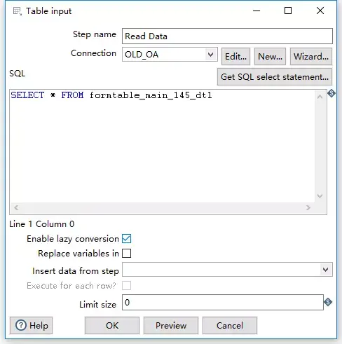 双击,弹出对话框,更改Step Name为 Read Data, 点击Connection 后面的new, 弹出对话框,填入数据库信息。测试成功后关闭。然后Connections选择数据库名字,如这里OLD_OA , 然后在SQL框里输入SQL语句,基本语句已经写好,可以修改相应内容就好了。输入完后可以点击Preview预览下内容,这时会弹出输入框要求输入默认行数,保持默认就好了。预览信息确认无误后,可以关闭,点击OK,这一步就是好了。