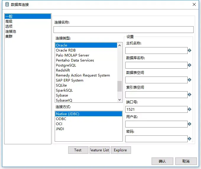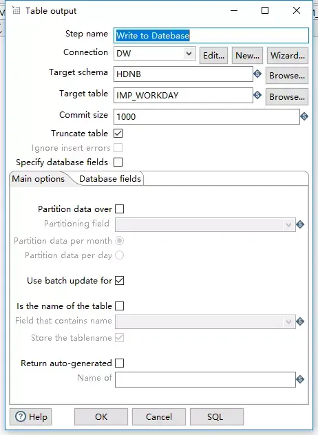 双击,修改Step name为 Write to Database, Connections 点击new填入数据库信息。这里要注意的是这里的数据是目标数据库,是要把信息存入的数据库。修改相应的信息,Connection里选择刚刚的数据库,Target schema为服务名, Target table写入数据库里未存在的表名。至此,好像除了点OK,都结束了。