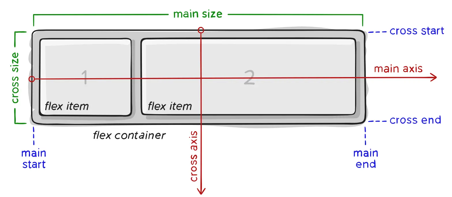 在开始之前,还是把这张图贴上,着重理解 Flex Box 里主轴(main axis)和交叉轴(cross axis)的概念。