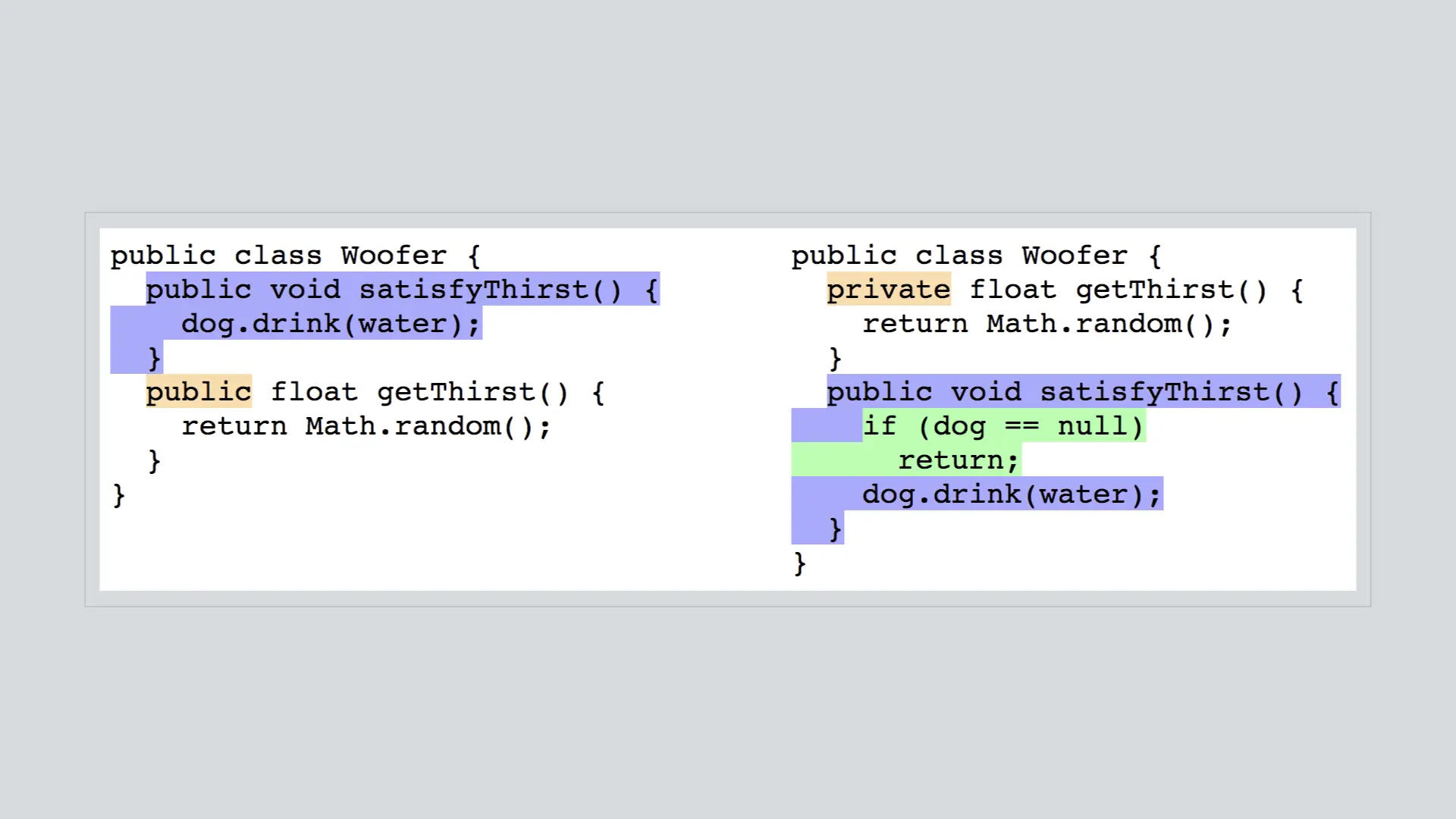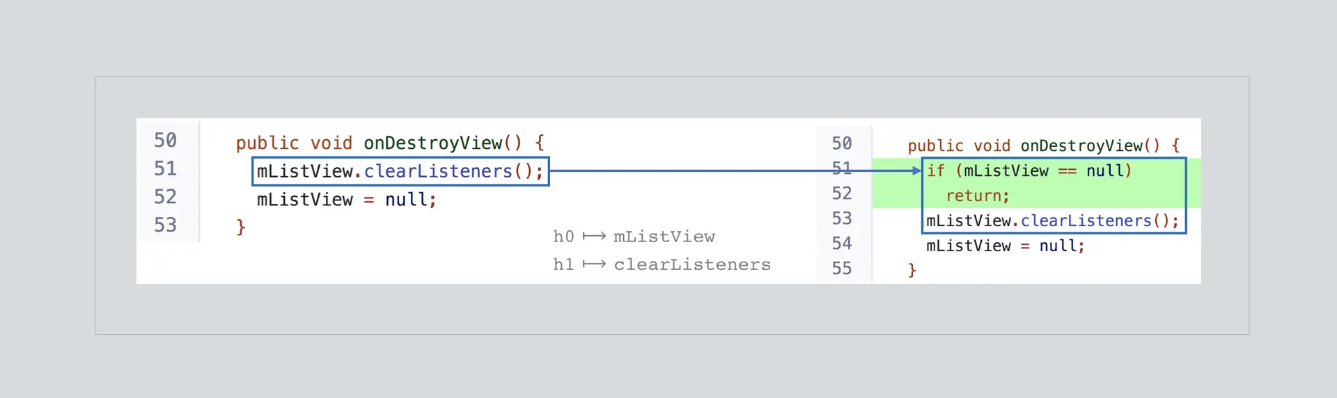 其中一个改进是我们把代码改动的上下文作为学习的重要依据。比如在前面的例子中,我们发现有两个修改都是在dog.drink(...)前面加上了if (dog == null) return;,尽管dog.drink(..);没有发生任何改变,这句代码依然被包含在了要前后对比的代码中,在更高层级的改动中,dog.drink(...)被合入了一个抽象层h0.h1(),后面我们会介绍一个更详细的例子。