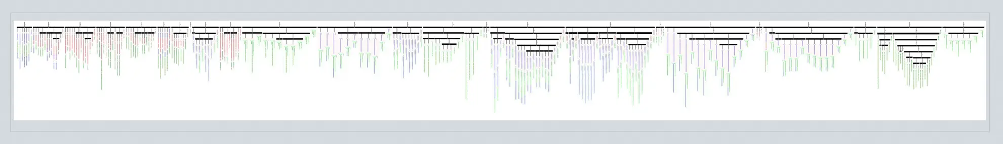 下面的这个动图表现了分析出来的层次聚类解构树状图(和之前举的例子一致)。每一行都展现了一次修改,“修改前”的是紫色,“修改后”的是蓝色,并且还包括了一些其他数据。每个垂直的黑色条表示了层级,最顶部的黑色条包含了所有修改模式。次层级的被包含在更小的黑条中。Anti-unification把“如果dog是null,提前返回”这样的修改和之前的一个修改结合起来,他们唯一的区别是之前的修改是dog.drink(water)。这样的结果是产生了一个新的修改模式。图中的h0,代表了一个修改模式“漏洞”。