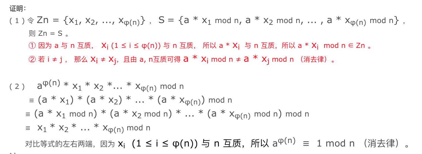 - 如果两个正整数a和n互质,那么一定可以找到整数b,使得 ab-1 被n整除,或者说ab被n除的余数是1