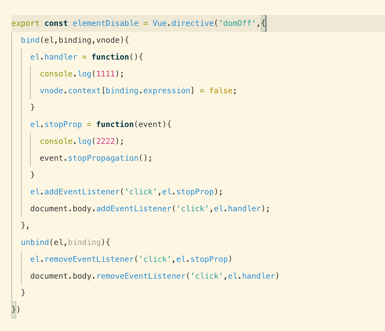 - 自定义指令里有钩子函数,我这里主要用了bind(初始化);unbind(卸载)这两个函数。