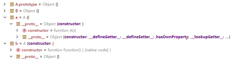 }所以a.__proto__为function A;b.__proto__为Object;A.prototype为Object;