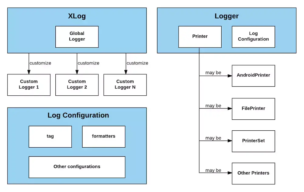 XLog.jpg Logger 类是日志中的核心类,其真正持有了 LogConfiguration 和 PrinterSet,并通过调度 LogConfiguration 和 PrinterSet 来进行日志的输出。