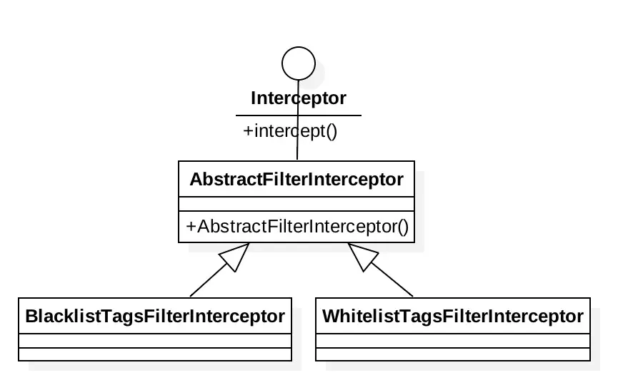 interceptor 与 OkHttp 中 interceptor 有点类似,也同样采用了职责链的设计模式,其简要的类图如下。