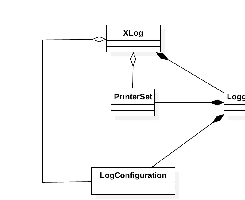 从上面的代码来看,其主要就是记录下了状态,及其 3 个静态变量 sLogConfiguration,sPrinter以及 sLogger,而 sLogConfiguration和sPrinter又拿来初始化了 sLogger,其关系如下类图所示。