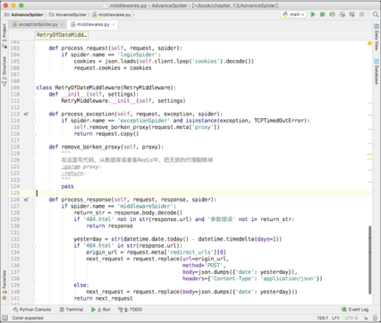 修改前面开发的重试中间件,添加一个process_exception()方法。这个方法接收3个参数,分别为request、exception和spider,如下图所示。