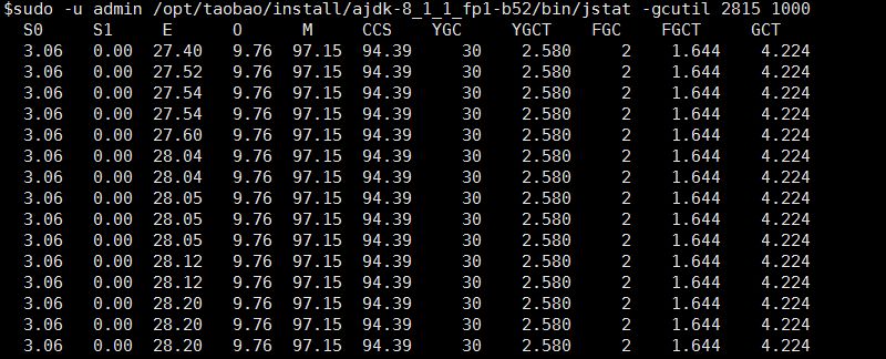 sudo -u admin /opt/taobao/install/ajdk-8_1_1_fp1-b52/bin/jstat -gcutil 2815 1000