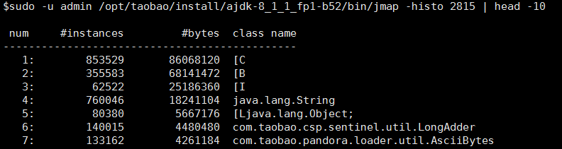 sudo -u admin /opt/taobao/install/ajdk-8_1_1_fp1-b52/bin/jmap -histo 2815 | head -10