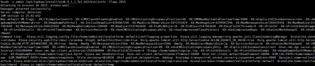 sudo -u admin /opt/taobao/install/ajdk-8_1_1_fp1-b52/bin/jinfo -flags 2815