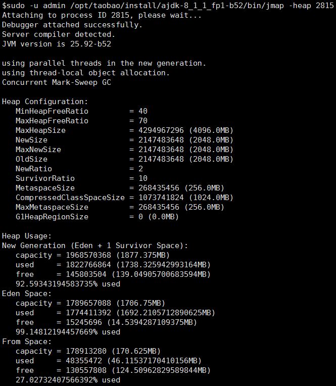 sudo -u admin /opt/taobao/install/ajdk-8_1_1_fp1-b52/bin/jmap -heap 2815
