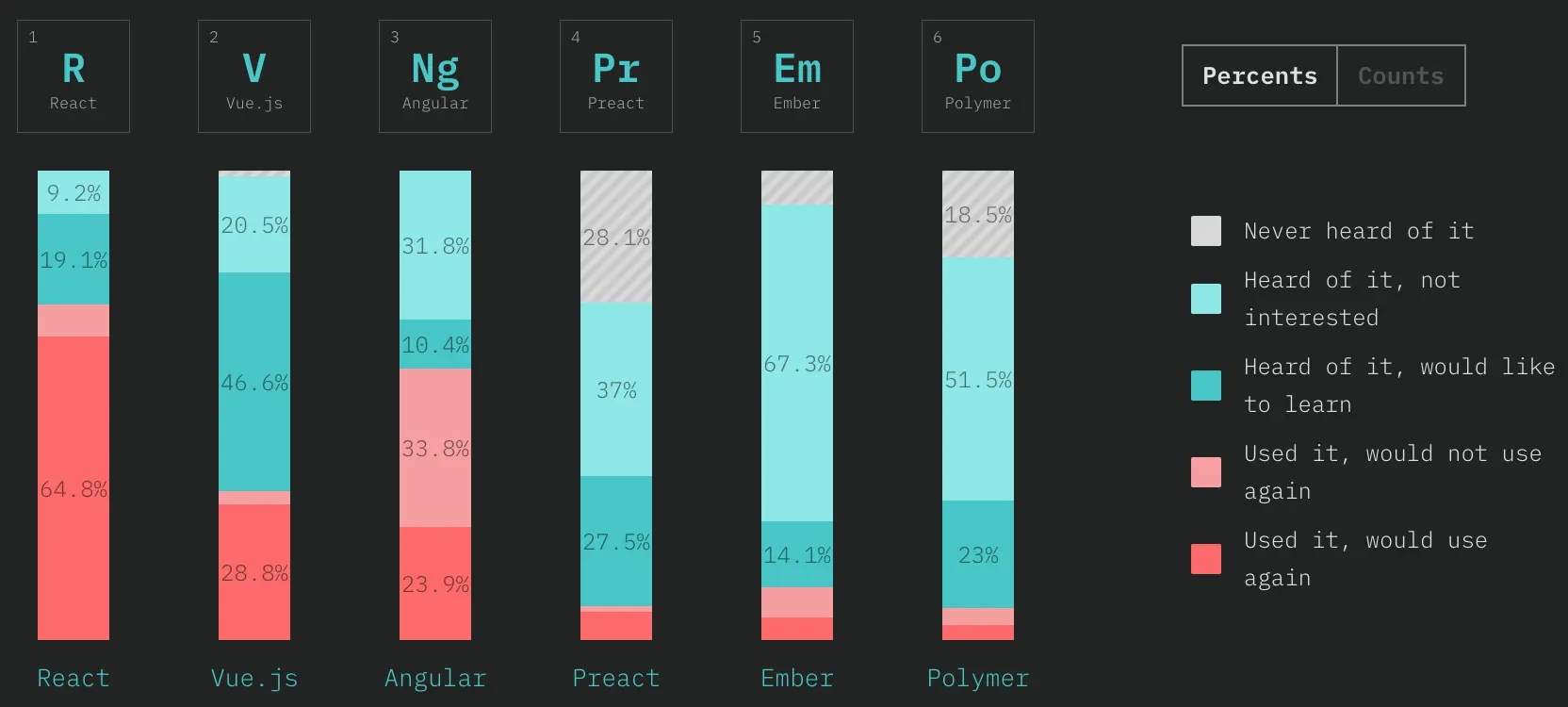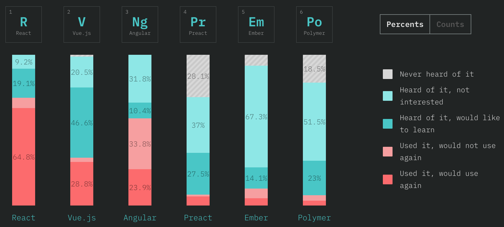 结果基本上和其他榜单类似,React 和 Vue 唱主角, Angular 有垮台的趋势。