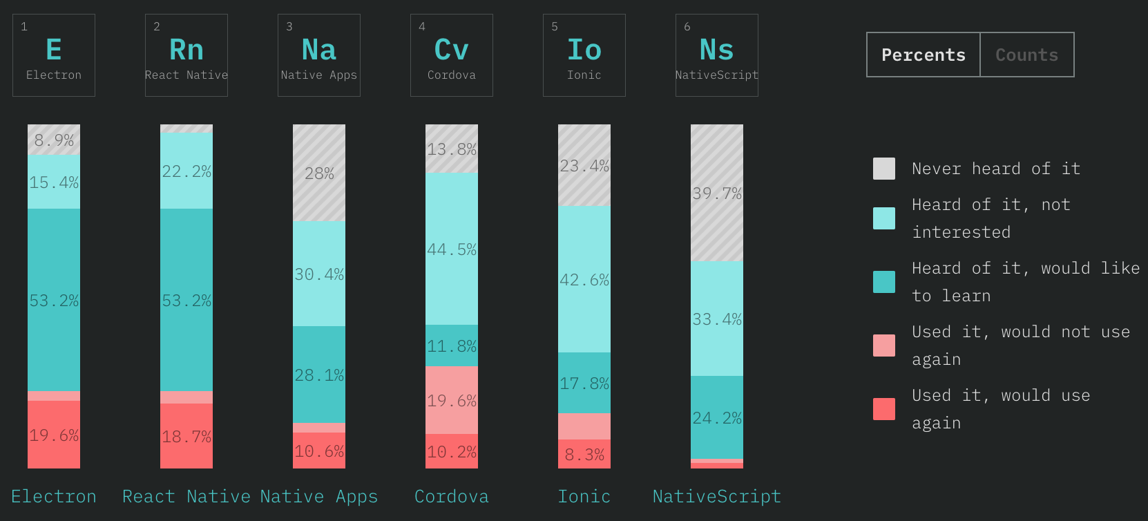 React Native 和 Electron 是使用 Web 技术构建移动和桌面应用的两个主要解决方案。巧合的是,他们在满意度和用户数量方面都表现出相似的数字。