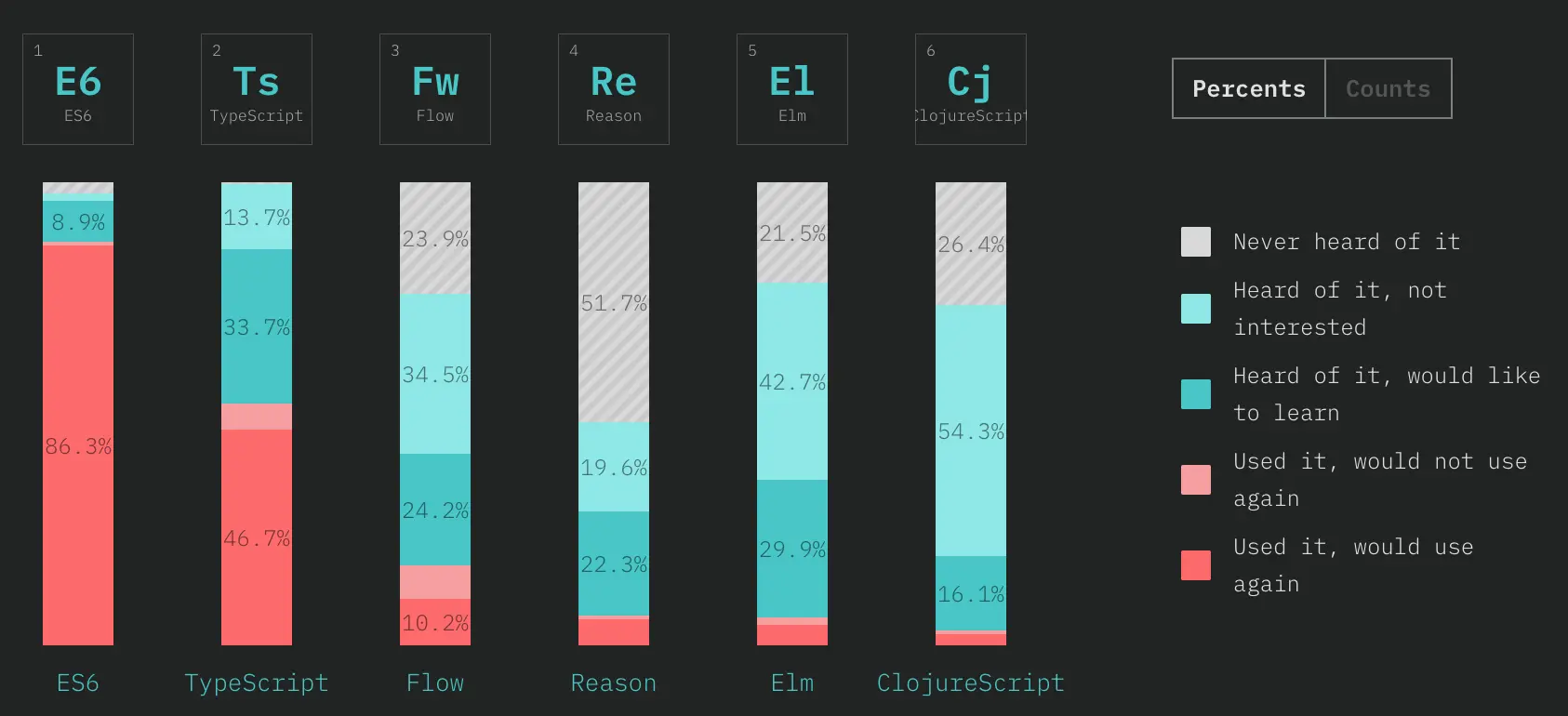 2018年的两位大赢家是 ES6 和 TypeScript 。另外 Reason 也值得关注,它背后有 Facebook 的支持,并且拥有非常高的满意度和兴趣值。