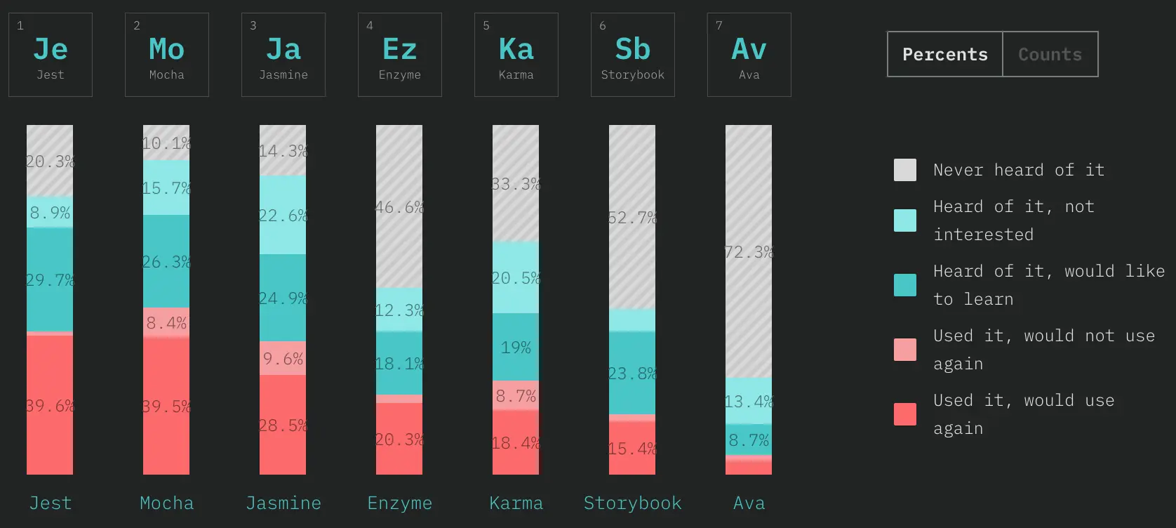 Jest 在使用率方面紧随其后,而且满意度略高于 Mocha(96% PK 82%)。这也是整个调查中满意度第二高的,仅次于 ES6 。