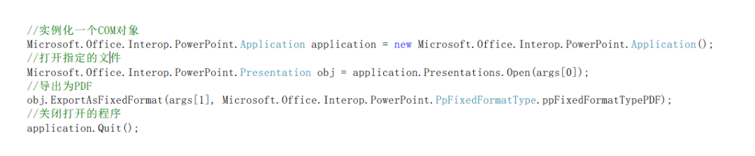 经过各种调查研究,使用C#的COM接口直接操作微软家的Office PowerPoint,让其将PPT文件另存为PDF,是一个比较稳妥,资源消耗也比较小的好办法。