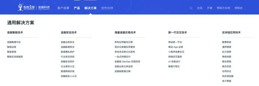 我们知道,2015年以来,蚂蚁金服陆续开放了包括分布式中间件、分布式数据库、区块链、生物识别在内的自主研发核心技术。到了2018年,蚂蚁金融云正式升级为蚂蚁科技开放平台。根据蚂蚁科技官网显示,目前蚂蚁对外开放的产品有80多个,而数字金融解决方案各有50余款。这些核心产品与方案都来自蚂蚁自身的实践。