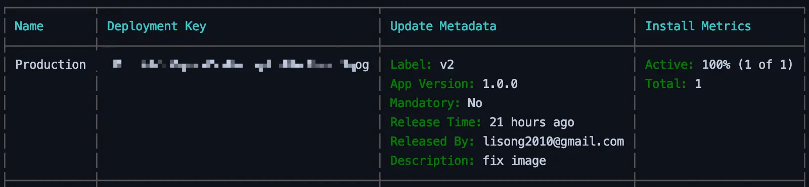 - 由于我们将 codepush sync 的逻辑放在了主页面组件加载过程中,所以会在每次加载时都是查询热更,在下次启动时应用更新,更新成功后,通过 codepush 命令行可以看到升级信息: