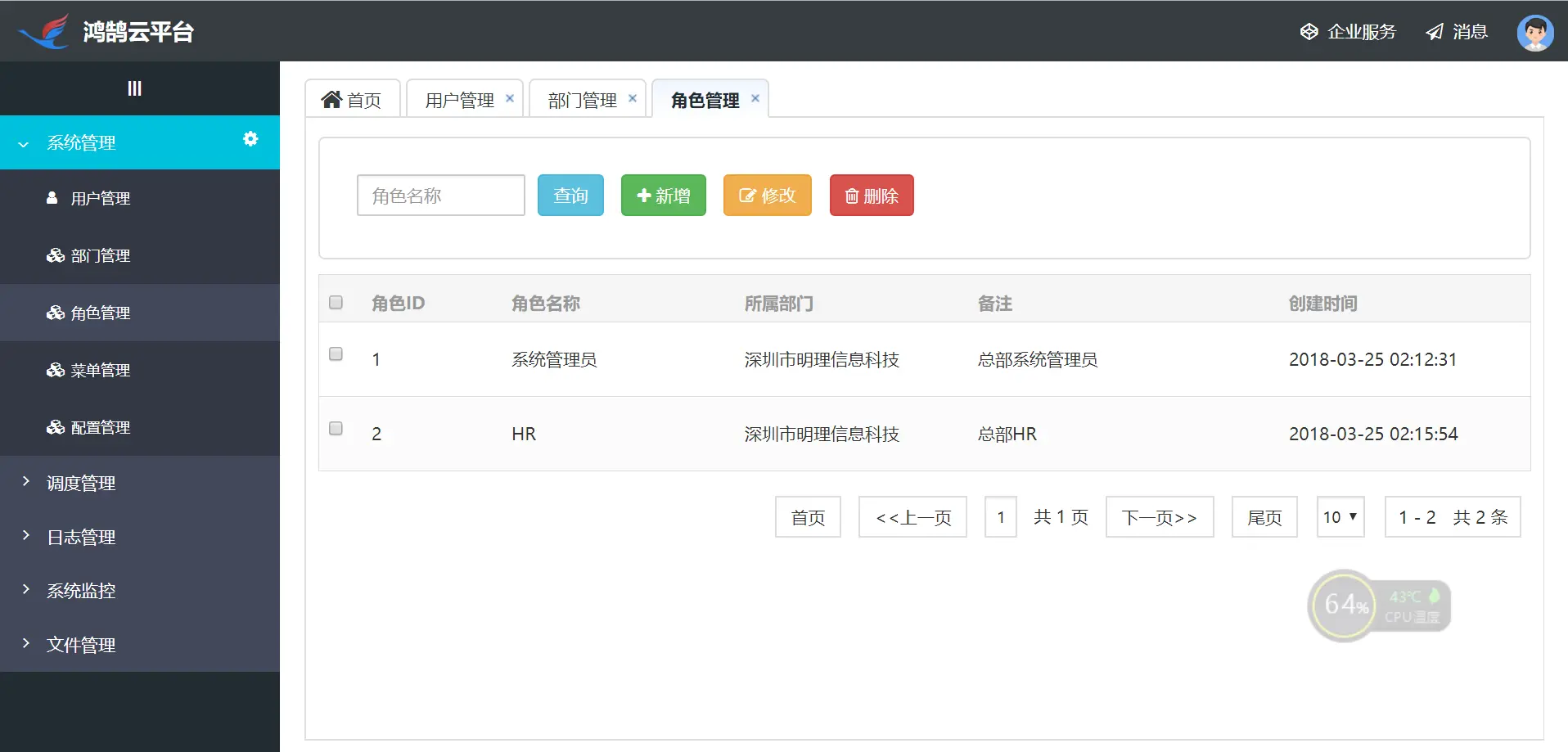 部门管理:配置系统组织机构,树结构展现,可随意调整上下级。