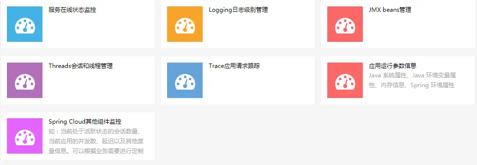 服务在线状态监控、Logging日志级别管理、JMX beans管理、Threads会话和线程管理、Trace应用请求跟踪