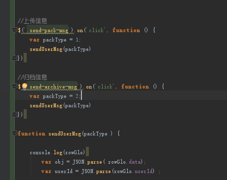 //归档信息 $('.send-archive-msg').on('click', function () { var packType = 2; sendUserMsg(packType) })