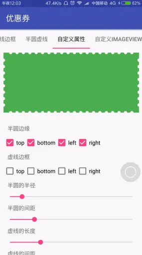 最近项目中刚好需要做优惠券效果,其他的都不难,关键在一个半圆锯齿和虚线边框的绘制,当然可以使用png图片作为背景来实现,这样很简单,但这样做会拉低整个App的档次,效果不好,修改也麻烦,之前看过网上有人用代码实现了这个效果,看了下原理,但始终用起来问题比较多,使用不灵活,自己就稍微总结了下,整理一个可以... 阅读原文