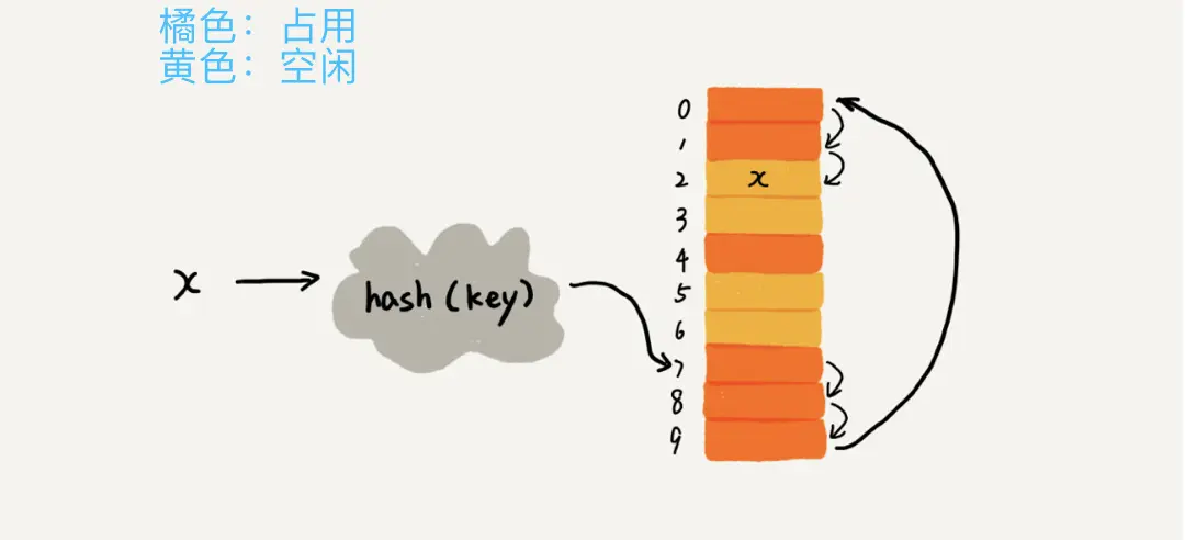 如果出现了散列冲突,就重新探测一个空闲位置,将数据插入(此时散列表中可能需要存储key和value)。简单的探测方法:线性探测(当前位置被占用,就从此往后依次查找,知道有空闲位置)
