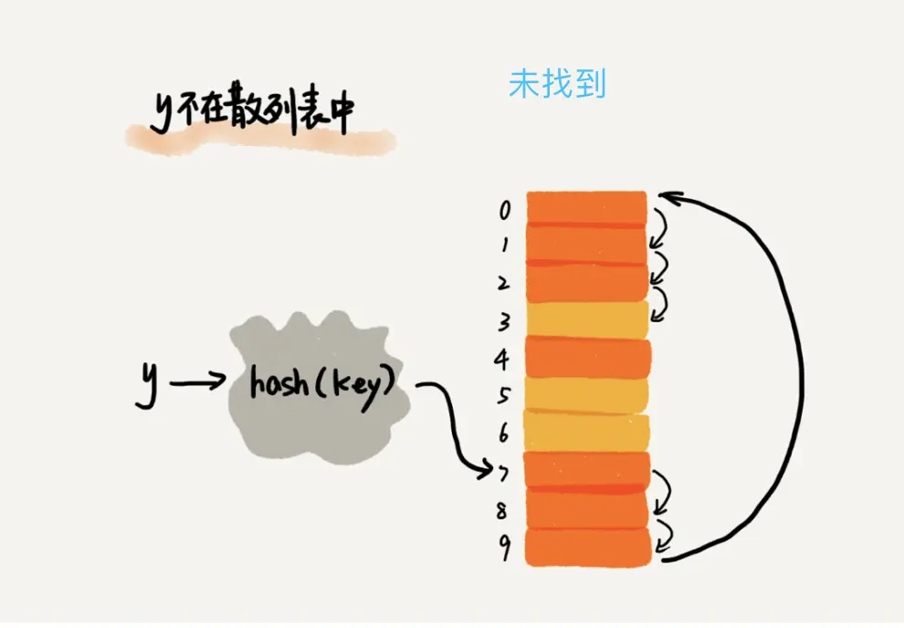 按照这种方式插入散列表,查找时则现根据散列值在数组中查找,未找到则依次向后查找直到遇到空闲位置,如还未找到则说明查找的元素未在散列表中。