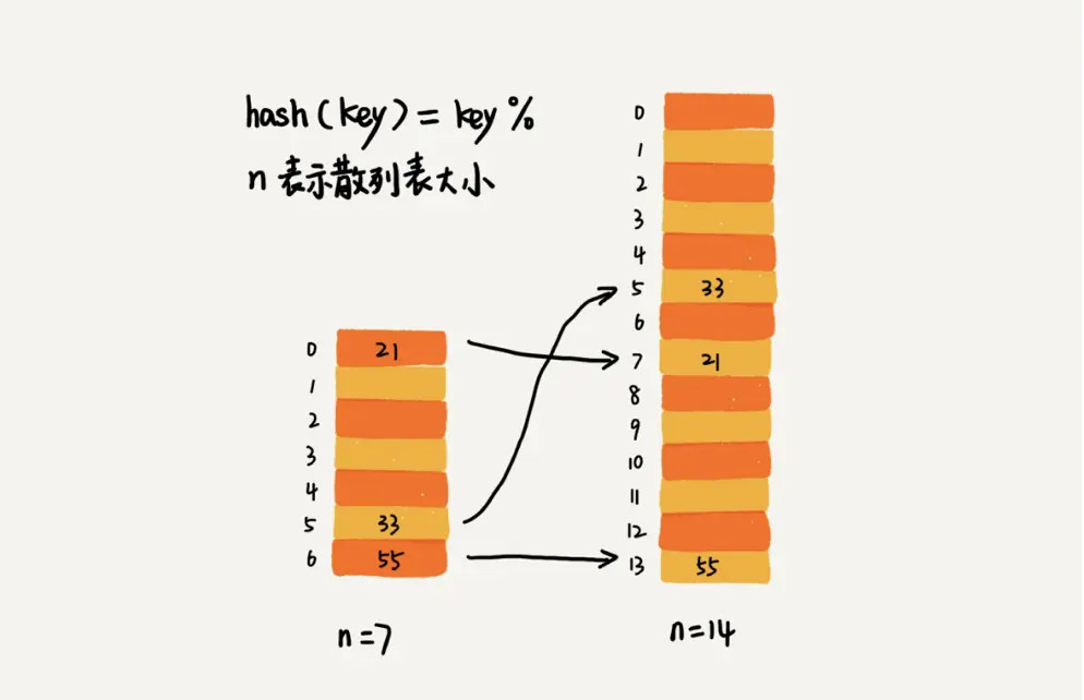 说明空闲位置减少,此时冲突增加,执行效率下降,则需要动态扩容。散列表扩容,虽然仍是扩容数组,但是由于容量n的变化可能造成散列值的变化。所以不止重新申请空间,还需要重新计算哈希值,变迁数据。