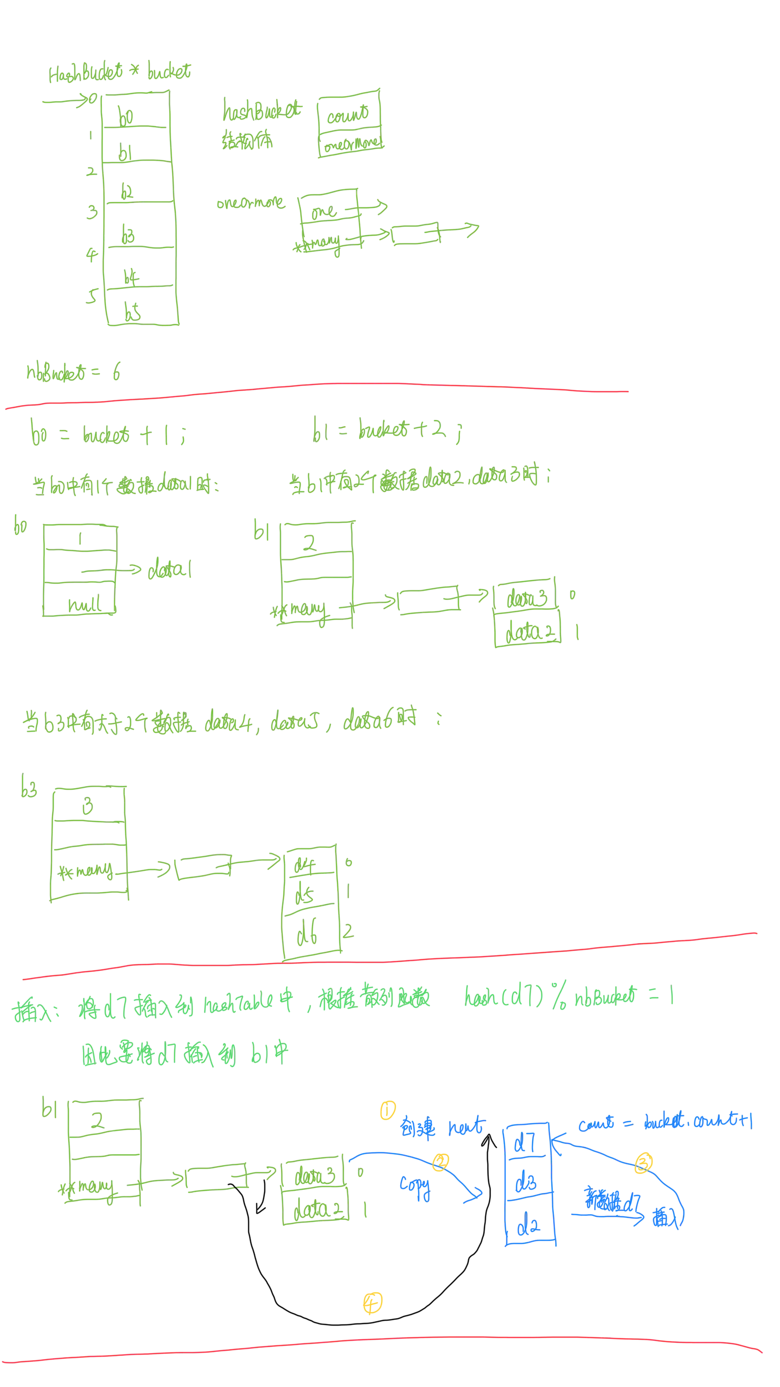 当插入数据后table.count(当前插入的总数据d1~d7)>nbBuckets(6)则进行扩容2n+1=13