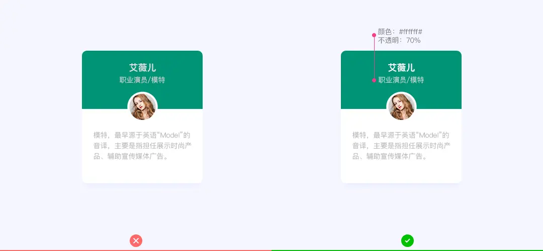 我们应该尝试着将文字让他更接近背景的颜色,这样更有利于创建画面的层级关系,而不是直接将灰色的文字放入有颜色的背景上。